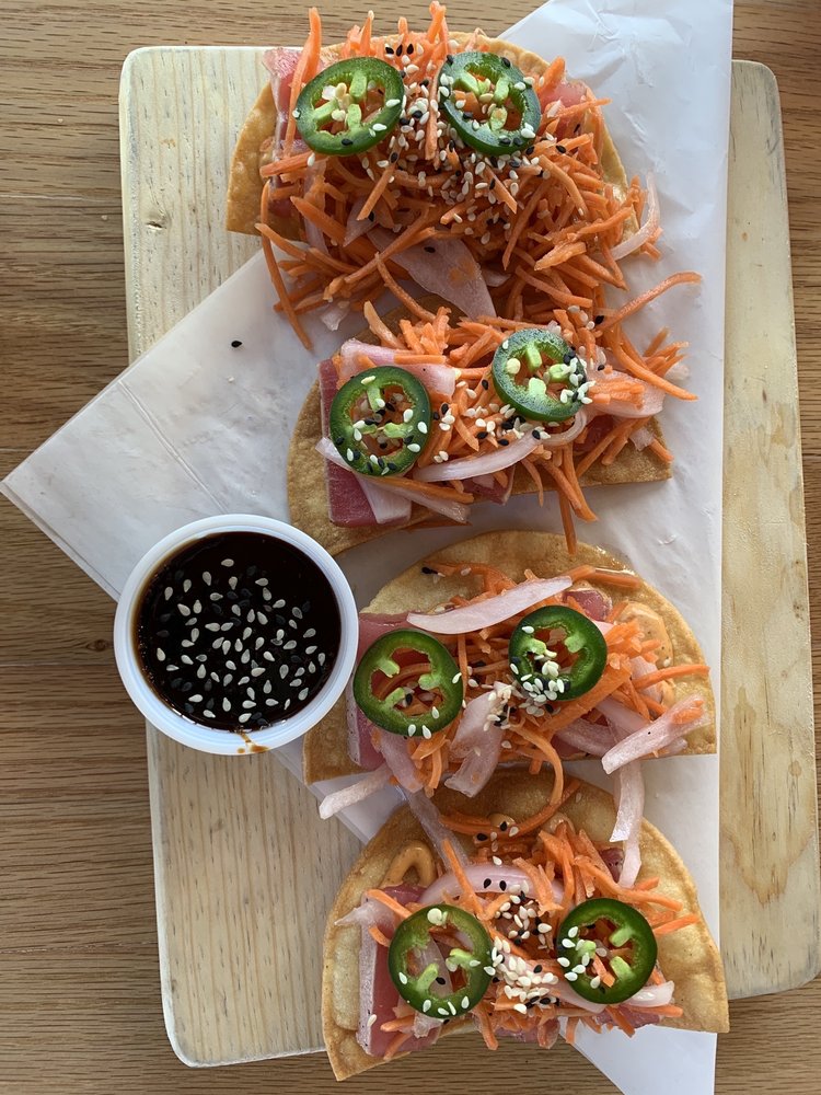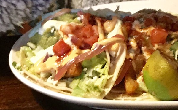 Baja fish (crispy or seared) avocado, cabbage, chipotle mayo, cilantro, corn tortillas.